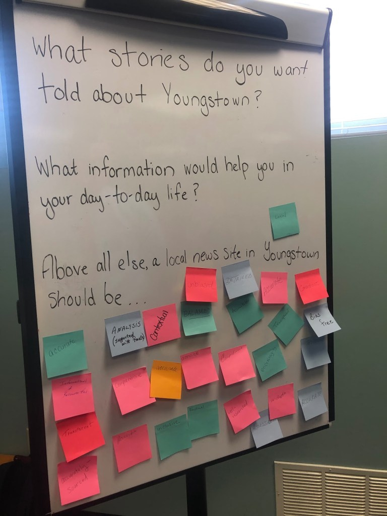 Themes emerged quickly. Attendees wanted to easily access and understand public resources, such as job listings, veterans’ resources, and affordable housing. They wanted a local news site to tell the full story of Youngstown through both spotlighting successes and uncovering corruption and misdeeds.
