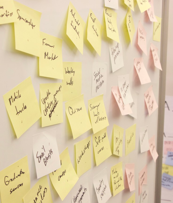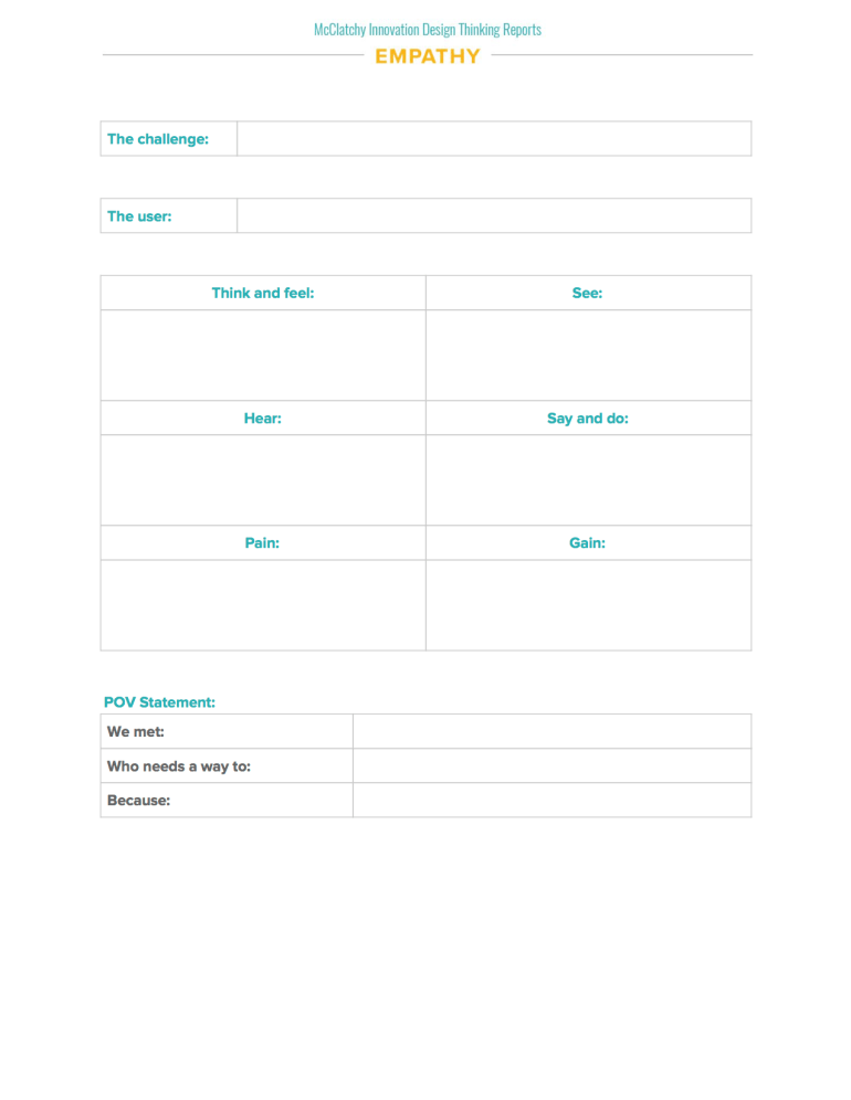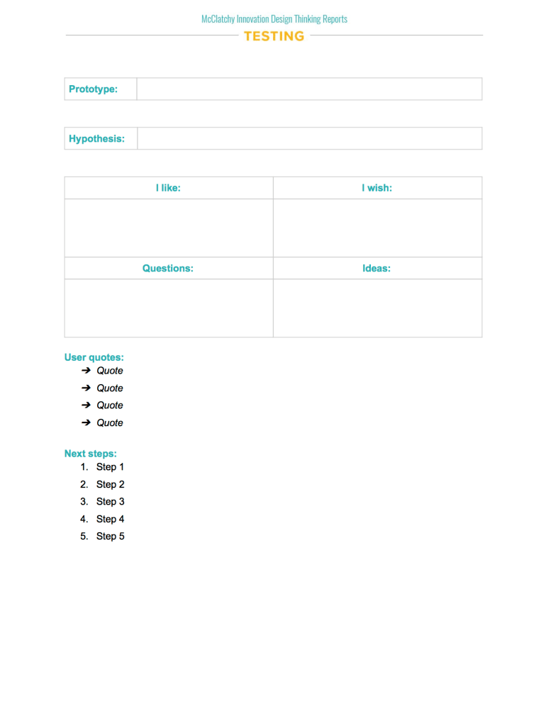 We used a combination of Stanford d.School, Google Five Day Sprint, IDEO and our own methodologies in our design-thinking programming. I partnered with our team’s design lead to create templates, guides and prompts to help cross-functional teams across McClatchy.
